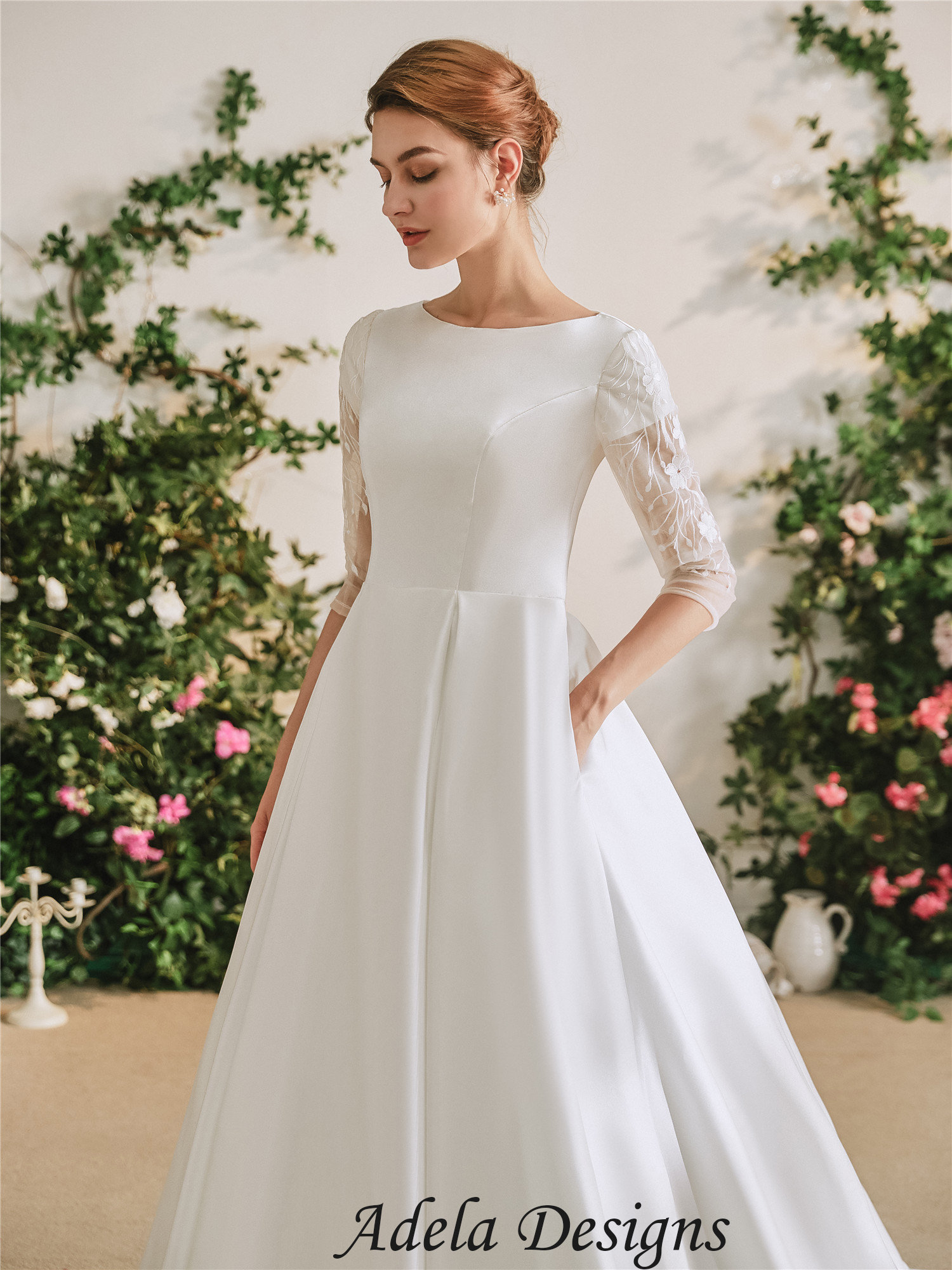 Modest Satin Wedding Dress Bridal Gown With Sheer Lace Sleeves Pockets 3 Quarter Sleeves Buttons High Back Aline Etsy